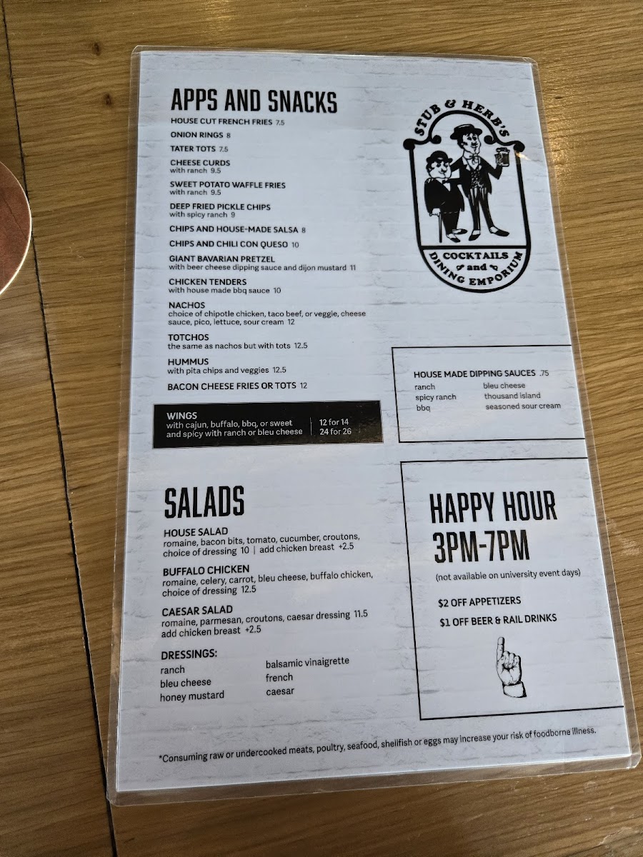 And for the wing enthusiasts, Stub and Herbs offers a delectable selection, including flavors like Cajun, Buffalo, and Sweet and Spicy, served with ranch or bleu cheese for only $16.00. Each bite encapsulates a perfect mix of flavor and heat, making it a fan favorite amongst locals and visitors alike.